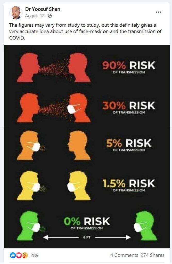 އެމެރިކާގެ ސީޑީސީ: 31 ޖުލައި 2020 ގައި އެމެރިކާގެ ސީޑީސީން ކޮވިޑާއި ގުޅިގެން އެބޭފުޅުންގެ ވެބްސައިޓްގައި ނެރެފައިވާ ޢާންމު ޞިއްޙަތުގެ އިރުޝާދުގައި ބުނެފައިވަނީ މިފަދައިން ނެވެ. “ޢަލާމާތްތައް ހުރި ނުވަތަ ނެތް ބަލި މީހަކަށް ހުށައެޅުނު ކޮންޓެކްޓަކަށް މާސްކުން ބަލިން ރައްކައުތެރި ކޮށްދޭނެ ކަމުގެ މައްޗަށް އޮތީ ވަރަށް މަދު މަޢުލޫމާތުތަކެކެވެ.”