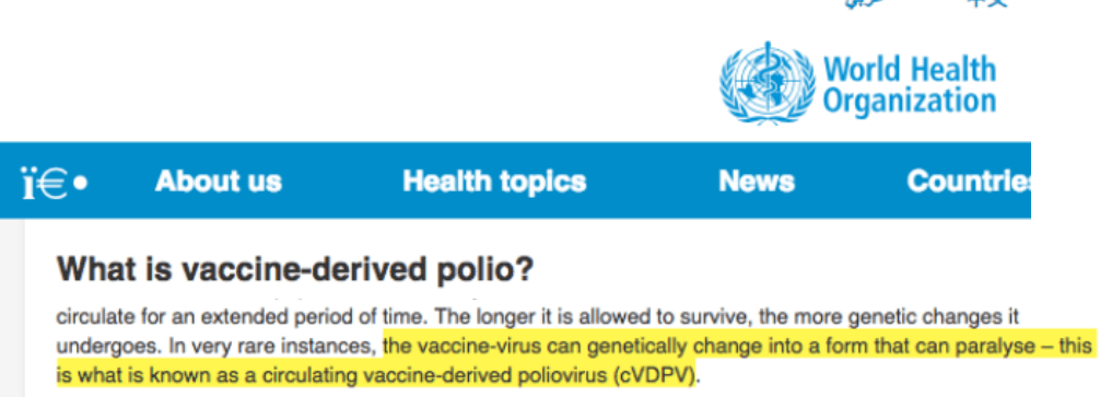 ވެކްސިން-ޑިރައިވްޑް-ޕޯލިއޯ ނުވަތަ ވެކްސިން ޖެހުމުން ޕޯލިއޯ ބަލި ފެތުރުމާއި ޖެހުމަކީ ކޮބައިކަން ބަޔާންކޮށް ޑަބްލިއުއެޗްއޯ ވެބްސައިޓްގައި ލިޔެފައިވަނީ މިފަދައިންނެވެ.