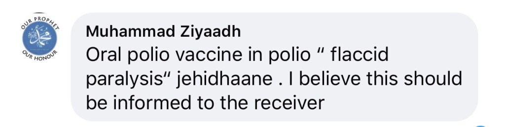 ޕޯލިއޯ ވެކްސިނަކީ ޕޯލިއޯއިން ރައްކައުތެރިވާން ނަމުގައި ޖަހާއެއްޗަކަށްވާއިރު އެއިން ވެސް ޕޯލިއޯ ދަރިފުޅަށް ޖެހިދާނެކަން މިއިން އެނގޭއިރު މި މައުލޫމާތު ޢާންމު ރައްޔިތުންނަށް ހާމަކުރެވިފައި ނުވުމަކީ ރައްޔިތުންނަށް ވެވޭ ޚިޔާނާތެކެވެ. މިއީ މައުލޫމާތު ވަންހަނާކުރުމުގައި ކުރާ ވައްކަމެކެވެ. މިފަދަ ޚިޔާނާތްތެރި ވައްކަމަކީ އެއްގޮތަކަށްވެސް ބަލައިގަނެވޭނެ ކަމެއް ނޫނެވެ. މިފަދަ އަނިޔާއެއް ލިބިދާނެ އެއްޗެއް ނުޖެހުމުގެ ހައްޤަކީ ކޮންމެ ތުއްތުކުއްޖަކަށް ލިބިގެންވާ އަސާސީ ހައްޤެކެވެ.