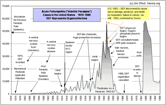 މަތީގައިވާ ގުރާފުން ފެންނަނީ 30 އަހަރުގެ މުއްދަތުގެ ތެރޭގައި ޑީ.ޑީ.ޓީ (ބީއެޗްސީ، ލީޑް، އާސެނިކް ފަދަ އެހެނިހެން ޕެސްޓިސައިޑް) އާއި ޕޯލިއޯއާއި ހުރި ގުޅުމެވެ. ޑީ.ޑީ.ޓީ ފަދަ ޕެސްޓިސައިޑް ބޭނުންކުރާ މިންވަރާ އެއްވަރަށް ވާބަލި ފެނިފައިވާ ކަމެވެ. ޑީ.ޑީ.ޓީ ބޭނުންކުރުން ގިނަކުރި ވަރަކަށް ވާ ބަލި ގިނަވެފައި، ޑީ.ޑީ.ޓީ ބޭނުންކުރުން މަދުކުރިވަރަކަށް ވާބަލި (ޕޯލިއޯ) މަދުވި ތަނެވެ.