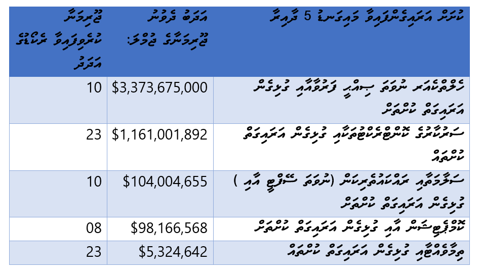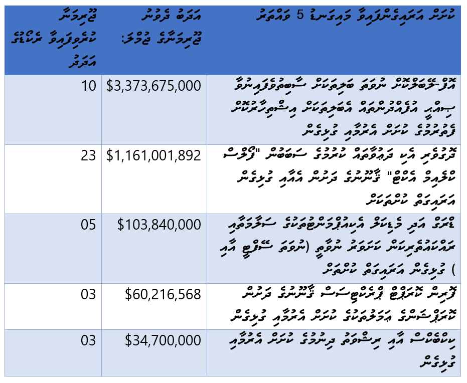 | ސަރުކާރުގެ ކޮންޓްރެކްޓުތަކާއި ގުޅިގެން އަރައިގަތް ކުށްތައް | $1,161,001,892 | 23 |