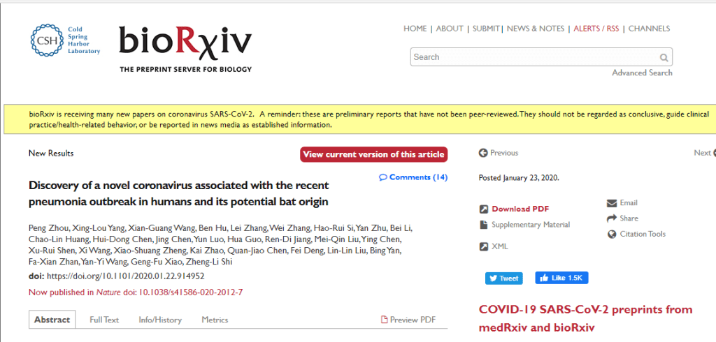 [6] Peng Zhou, el at. Discovery of a novel coronavirus associated with the recent pneumonia outbreak in humans and its potential bat origin. https://www.biorxiv.org/content/10.1101/2020.01.22.914952v1