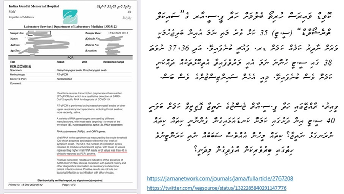 “އެމީހުން އަދި (ކޮވިޑް-19) ވައިރަސް އައިޑެންޓިފައިކޮށް ހޯދާފައެއް ނެތް. އެމީހުން ޓެސްޓު އެކުރަނީ ކޮން އެއްޗަކަށް ތޯ؟ އެކުރަނީ ޑީއެންއޭ ( އާރުއެންއޭ ) ސީކްއެންސްތަކުގެ ފްރެގްމެންޓް ތަކަކަށް. މީހުންނަށް ފަހުމްވާން ޖެހޭ، މި މީހުން ކޮރޯނާ ވައިރަސް އައިސޮލޭޓް ކޮށް، ޕިއުރިފައި ކޮށް، ރީޕްރޮޑިއުސް ކޮށް، އެ ވައިރަސް އެއް ޖަނަވާރުތައް ބޭނުންކޮށް ބަލިޖައްސާ އެއްޗެއްތޯ ޓެސްޓު ކޮށްފައިނުވޭ. ވައިރަސް އެއް ހޯދޭނީ ވައިރަސްއެއް އައިސޮލޭޓް ކޮށްގެން. އޭގެ ވަށައިގެންވާ ދައުރުކުރާ އެހެން ބޭކާރު އެއްޗެހިން އެ ސާފުކޮށް ޕިއުރިފައި ކޮށްގެން. އަދި އޭތި އާލާކޮށްގެން، އެއިން އާލާކުރެވުނީ ކުނިބުނި ނޫންކަން ޔަޤީންކޮށްގެން. އަދި ތިބުނާ ޢަލާމާތްތައް ފެންނަނީ އެ ވައިރަސްގެ ސަބަބުން ކަން ޓެސްޓުކޮށް ތަޙުލީލުކޮށްގެން. އެމީހުންނެއް މިކަމެއް ނުކުރޭ. އެހެންކަމުން، ގޭގޭގެ ދޮރުން-ދޮރަށް ގޮސް ސިފައިން ބޭނުންކޮށް މި ކުރަނީ ކޮން ޓެސްޓެއް؟ އެމީހުން ޓެސްޓު އެކުރަނީ އަހަރެމެން އަޅުވެތިކޮށް ކޮންޓްރޯލް ކުރެވޭނީ ކިހާވަރަކަށް ތޯ ބަލަން؟”