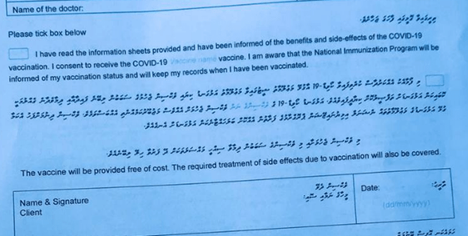“ކޮވިޑް ވެކްސިން ޖަހައިގެން ދިމާވި ކަމެއްތޯ ބަލަން ހަދާ ޓެސްޓު އާސަންދައިން ކަވާ ނުކުރޭ. އެ ޓެސްޓެސް އައިޖީއެމްއެޗް އަކުން ނުކުރެވޭ. އެކުރެވެނީ ޓްރީޓޮޕް ހޮސްޕިޓަލުން. އެންސްޕާއަށް ލި ފޯމުގައި ސާފު އިބާރާތުން ލިޔެފަ އެބަހުރި ކޮވިޑް ވެކްސިންގެ ސަބަބުން ދިމާވި ކަމެއްތޯ ބެލުމަށް ކަމަށް.” – ރާއްޕެ