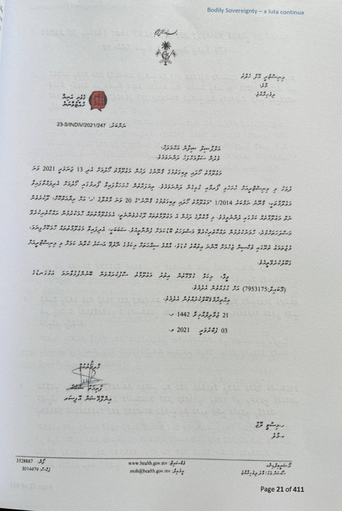 ހެލްތް ޑިފެންސް މޯލްޑިވްސް ގެ ފަރާތުން ތައްޔާރުކޮށްފައިވާ ރިޕޯޓު “ބޮޑިލީ ސަވަރިންޓީ – އަ ލޫތާ ކޮންތިނޫއަ” އަކީ އަމިއްލަ ހަށިގަނޑުގެ މިނިވަންކަމާއި، ބޭސްފަރުވާގެ ކޮންމެ އަމަލަކަށް ރުހުން ދިނުމާއި ޞިއްޙީ މިނިވަންކަމަކީ ދިވެހިރާއްޖޭގެ ޤާނޫނު އަސާސީއާއި ބައިނަލް އަޤްވާމީ ޤާނޫނުތަކުން ވެސް ކަށަވަރުކޮށްދީފައިވާ އަސާސީ ޙައްޤުތަކެއް ކަމަށްވުމާއެކު މި ޙައްޤުތަކަށް ހުރުމަތްތެރިކޮށް ހިތާ ރައްކާތެރިކުރުމަކީ މުހިންމު އަދި ކުރަންޖެހޭނެ ކަމެއް ކަމަށް ދެކި ތައްޔާރުކޮށްފައިވާ ރިޕޯޓެކެވެ.